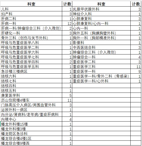 提供反馈材料具体要求:1、检验、检查类:需要提供该患者在本次住院期间涉及到该项目的所有检验、检查的报告单;2、诊疗类项目(经支气管镜治疗、中医埋针等)需要提供医嘱单、记录单、手术记录单及会诊单等;3、药品类涉嫌超医保限定条件支付条件报销:需要提供出院诊断、医嘱、病程记录、化验、报告单等,涉及科室如下: